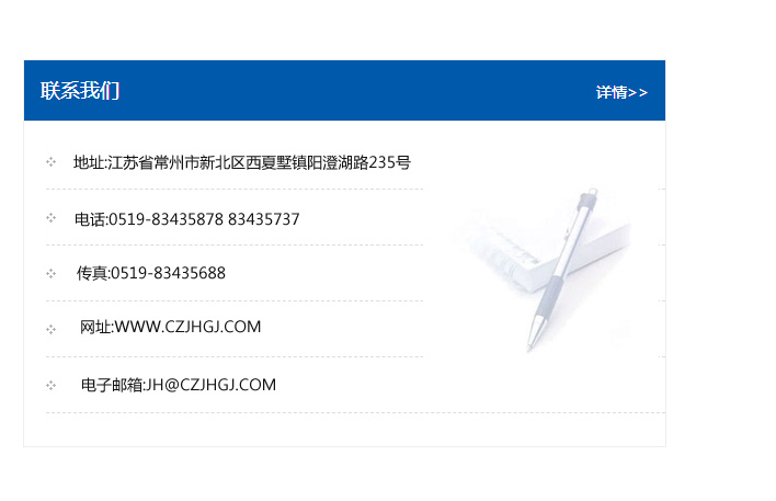 地址:常州市新北區友邦商務大廈1幢16、17層  電話:0519-85101652  傳真:0519-85112595  郵編:213022  網址:www.cz-jiayue_cn.sjhuihuang.com  郵箱:xiajifengaa@163.com